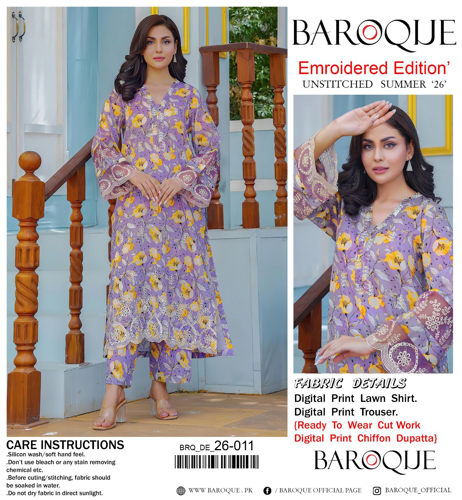 Ideal for women who value breathable fabric, smooth stitching, and lightweight style, the Baroque Lawn 3 Piece Suit blends durability, softness, and elegant simplicity. It’s the perfect choice for everyday summer wear, offering a consistently fresh and airy feel.