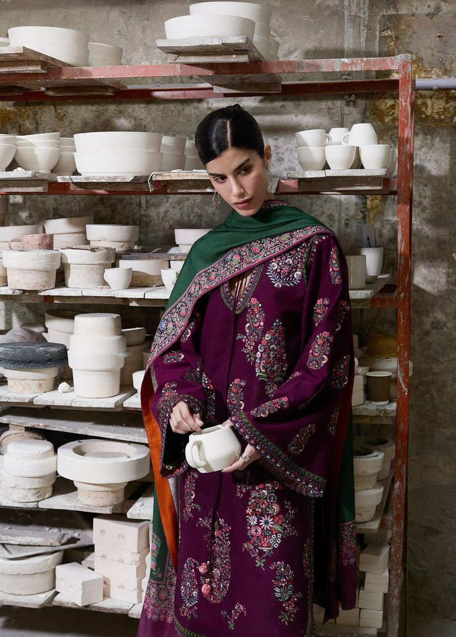 This 3 piece luxury outfit features a full heavy embroidered front crafted with thread embroidery, creating a designer-inspired and sophisticated appearance. The sleeves are heavily embroidered to complement the front embroidery, adding depth and elegance. The daman is enhanced with an embroidered patch, completing the outfit’s refined look and making it perfect for family gatherings and Eid celebrations.